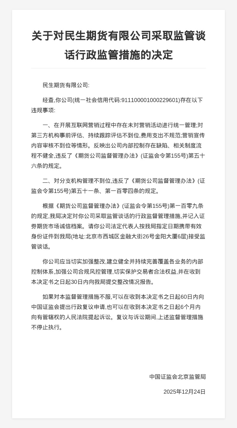 蓝鲸新闻1月5日讯,近日,中国证监会北京监管局发布行政监管措施决定书,剑指民生期货有限公司。