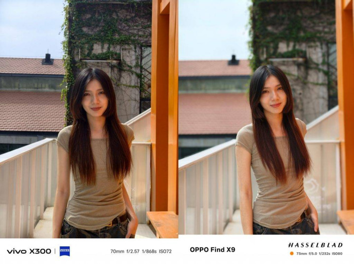 而面对阴天灰蒙蒙的人像场景,OPPO Find X9 的色彩表现要相对更舒服,并且虚化也很到位,相比较下 vivo X300 则更以光感还原为主。