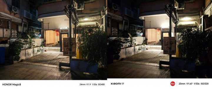 不过到了晚上,小米 17 面对高光会有点乏力,很容易出现高光溢出的情况,暗处的细节也容易丢失,而荣耀 Magic 8 则会处理得更舒适。