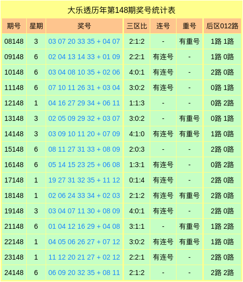 历年同期大乐透奖号数据统计表